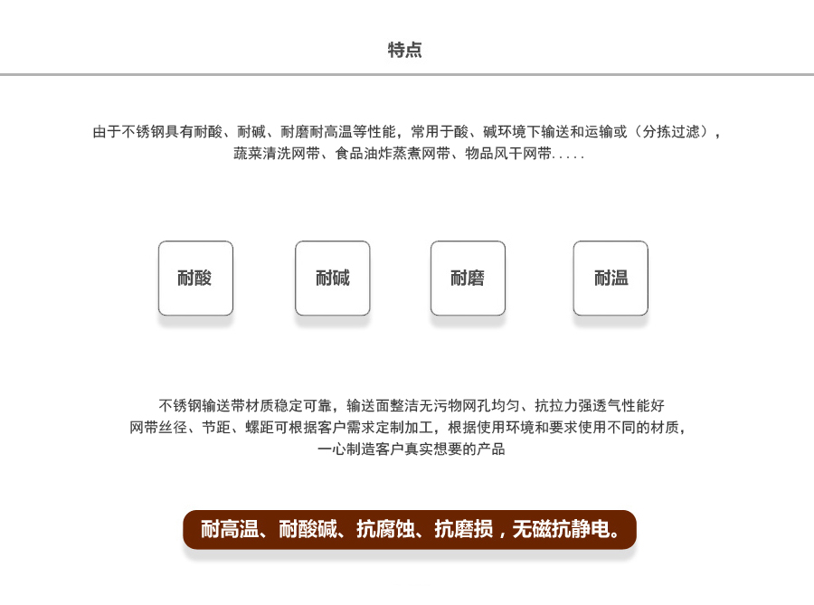 不銹鋼網(wǎng)帶屬于非標準件,我們將根據(jù)你提供的規(guī)格長寬,材質(zhì),絲徑,編制結構尺寸,支軸直徑,支軸間距,鏈條型號等數(shù)據(jù)核算成本和制作.